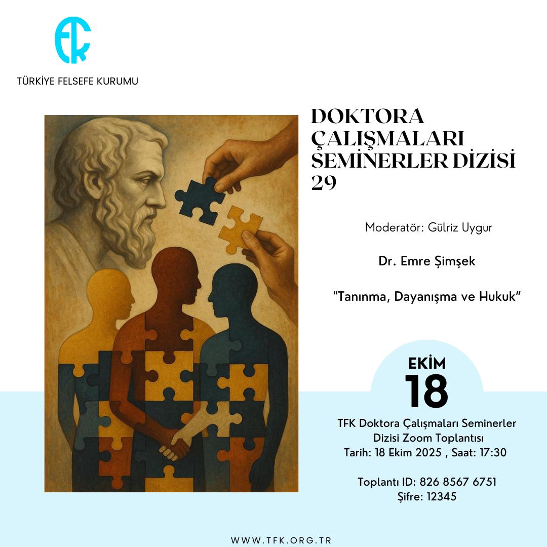 "Doktora Çalışmaları Seminerleri" dizisinin yirmi dokuzuncusu, 18 Ekim 2025, Cumartesi günü, saat 17:30'da, Prof. Dr. Gülriz Uygur'un moderatörlüğünde, Dr. Emre Şimşek'in "Tanınma, Dayanışma ve Hukuk" başlıklı konuşmasıyla gerçekleştirilecektir.