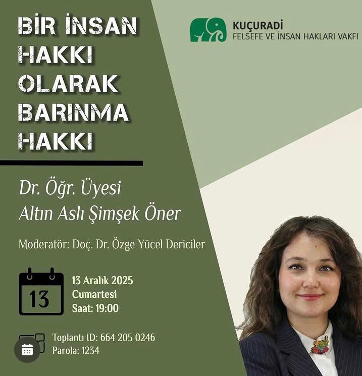 13 Aralık 2025 Cumartesi günü, saat 19:00’da, Doç. Dr. Özge Yücel Dericiler’in moderatörlüğünde, Dr. Öğr. Üyesi Altın Aslı Şimşek Öner’in “Bir İnsan Hakkı Olarak Barınma Hakkı” başlıklı konuşmasıyla gerçekleştirilecektir.