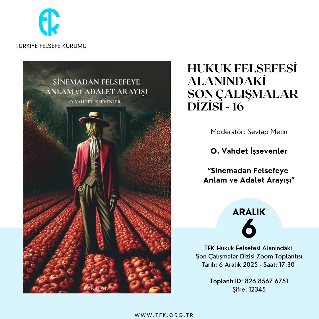 Hukuk Felsefesi Birimimiz tarafından “Hukuk Felsefesi Alanındaki Son Çalışmalar Dizisi” kapsamında düzenlenen toplantıların on altıncısı, 6 Aralık 2025, Cumartesi günü, saat 17:30’da, Sevtap Metin’in moderatörlüğünde, O. Vahdet İşsevenler’in “Sinemadan Felsefeye Anlam ve Adalet Arayışı” başlıklı konuşmasıyla gerçekleştirilecektir.