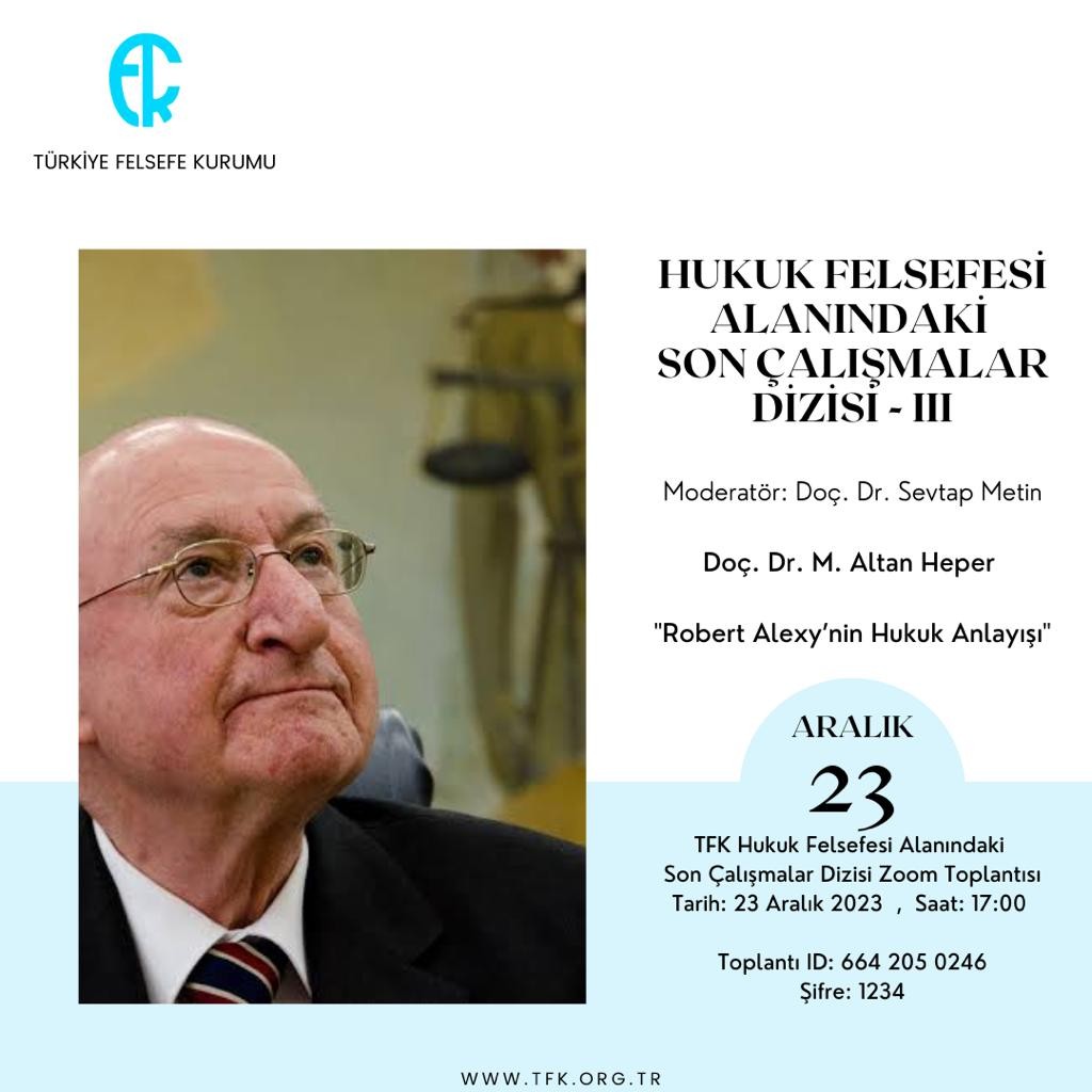 Hukuk Birimimiz tarafından düzenlenen "Hukuk Felsefesi Alanındaki Son Çalışmalar" dizisinin üçüncüsü, 23 Aralık 2023 Cumartesi günü, saat 17.00'de, Doç. Dr. Sevtap Metin'in moderatörlüğünde, Doç. Dr. M. Altan Heper'in "Robert Alexy'nin Hukuk Anlayışı" başlıklı konuşmasıyla gerçekleştirilecektir.