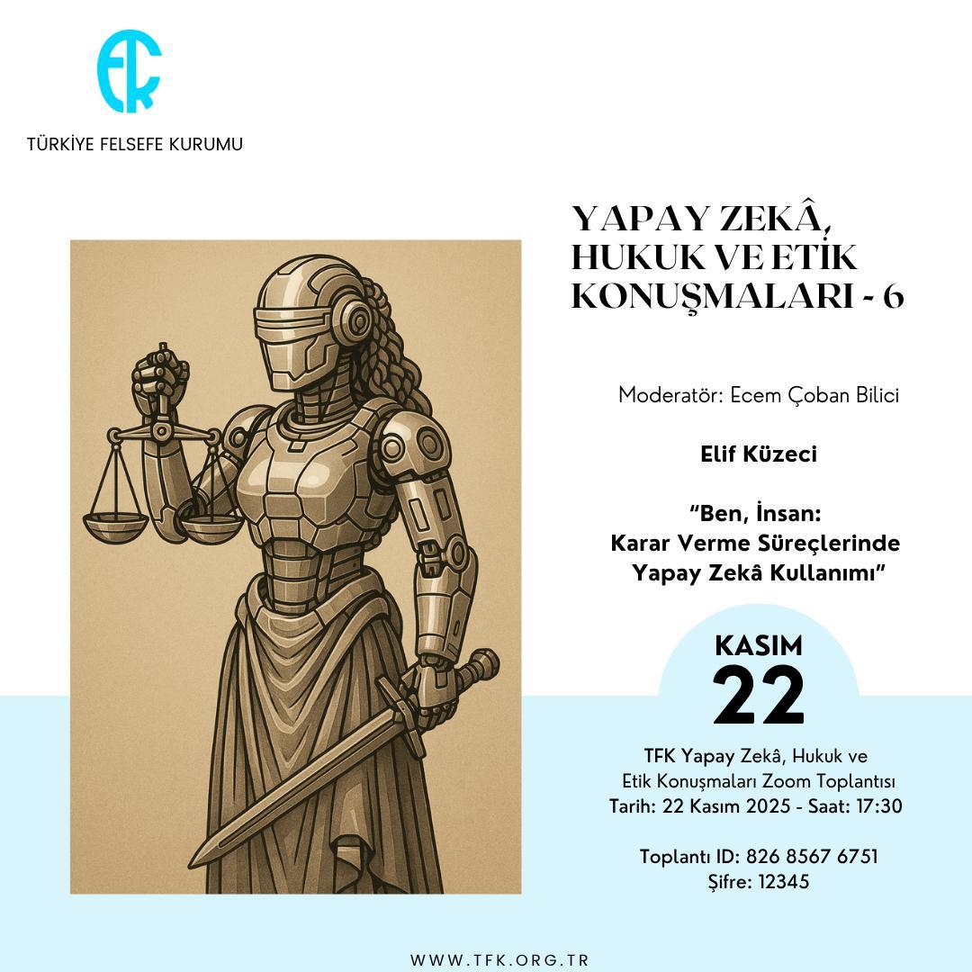 Hukuk Felsefesi Birimimiz tarafından “Hukuk Felsefesi Alanındaki Son Çalışmalar Dizisi” kapsamında düzenlenen “Yapay Zekâ, Hukuk ve Etik Konuşmaları”nın altıncısı, 22 Kasım 2025, Cumartesi günü, saat 17:30’da, Ecem Çoban Bilici’nin moderatörlüğünde, Elif Küzeci’nin “Ben, İnsan: Karar Verme Süreçlerinde Yapay Zekâ Kullanımı” başlıklı konuşmasıyla gerçekleştirilecektir.